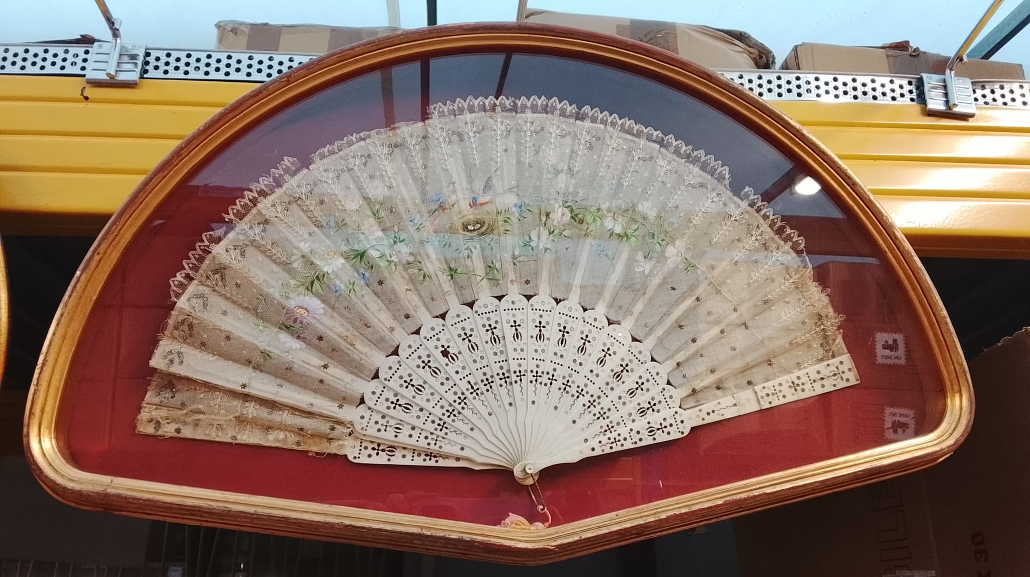 Ventaglio in pizzo dipinto in teca con vetro bombato