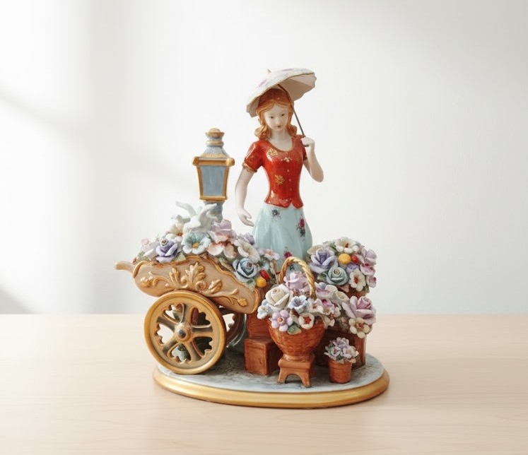 Gruppo in porcellana capodimonte “fiorista con carretto e ombrellino”